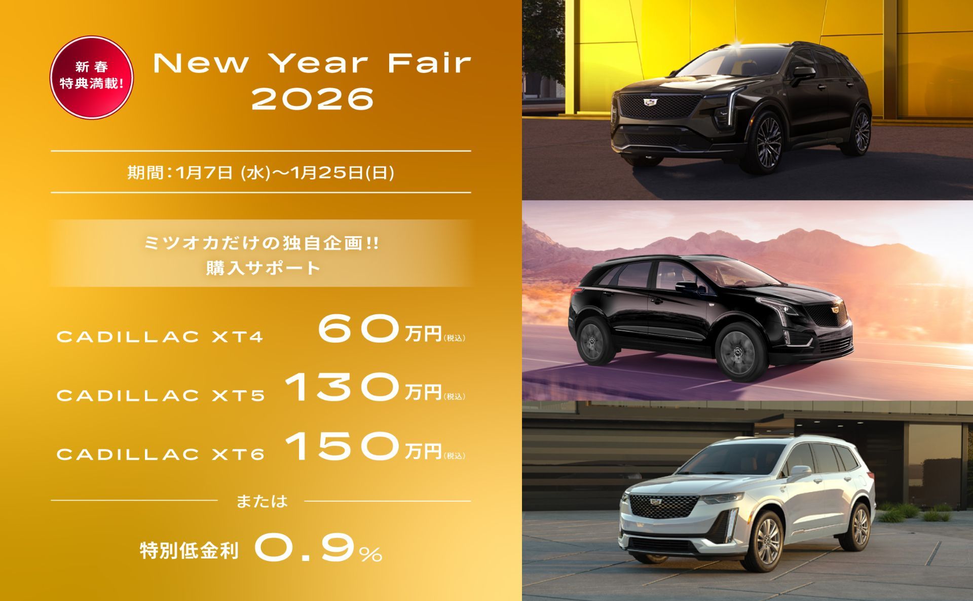キャデラック XT4/XT5/XT6にフェア期間限定のミツオカだけの成約特典をご用意いたしました。