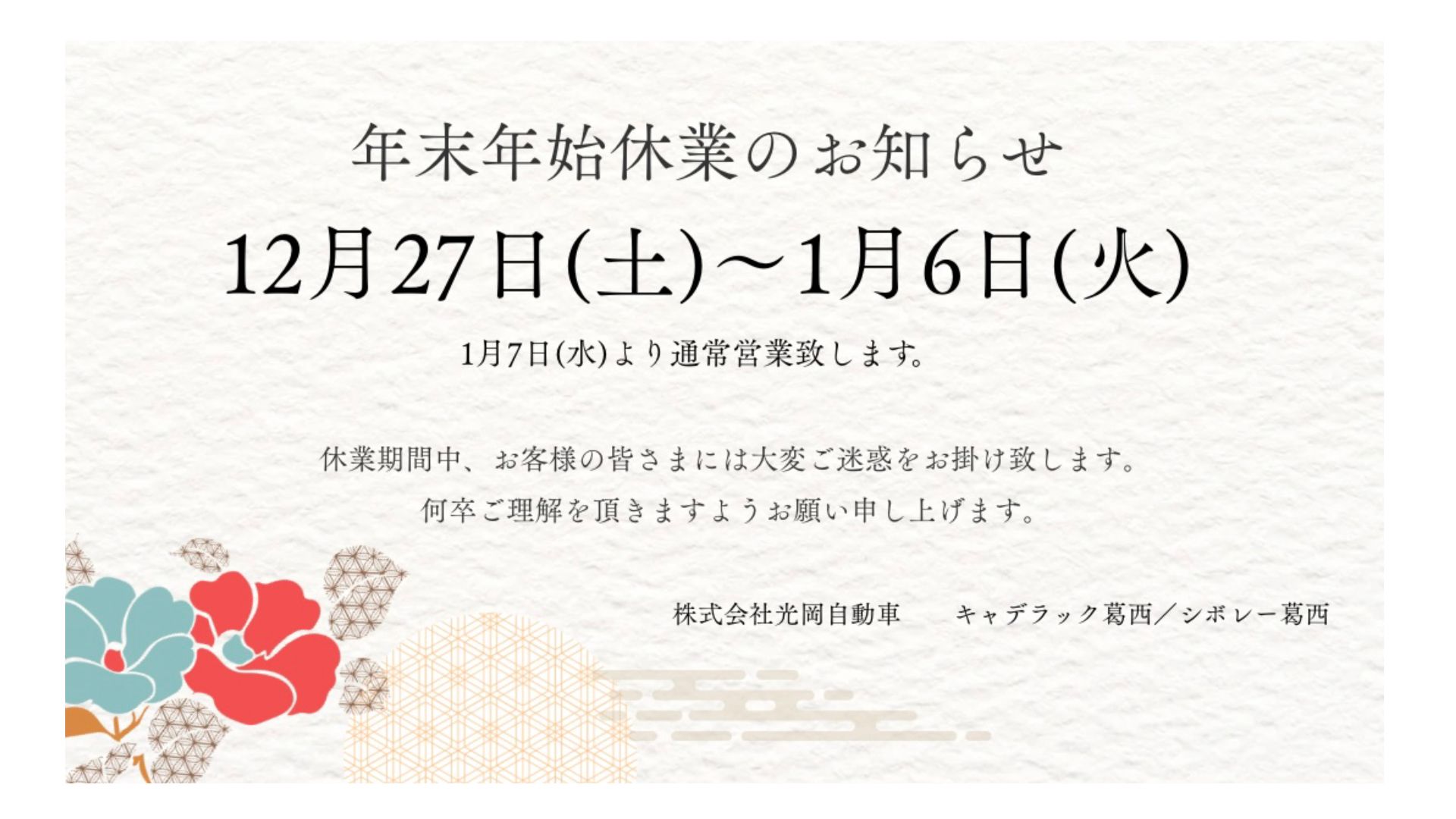 ※各種お問い合わせ、修理・整備などにつきましては2026年1月7日(水)より順次ご対応させていただきます。