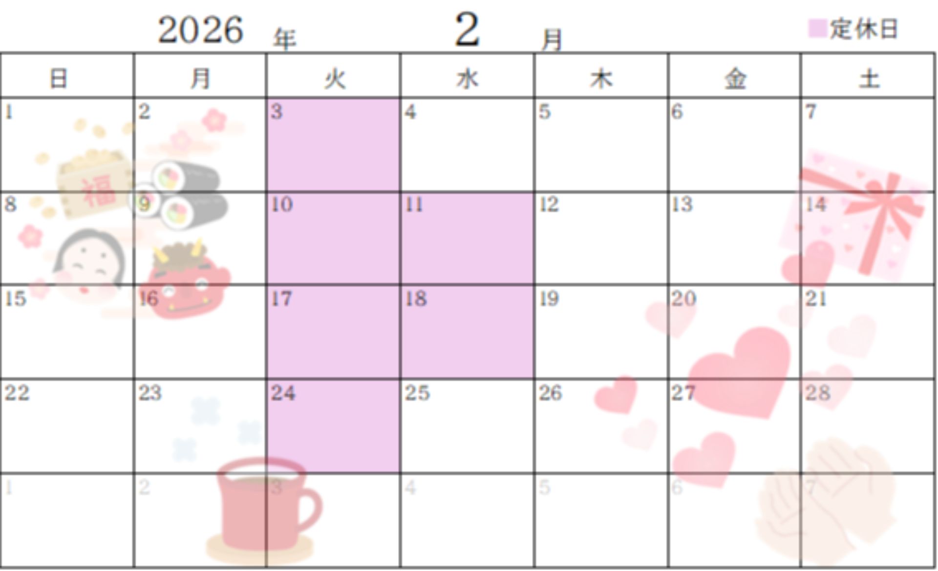 3日(火)10日(火)11日(水)17日(火) 18日(水)24日(火) 定休日となります。