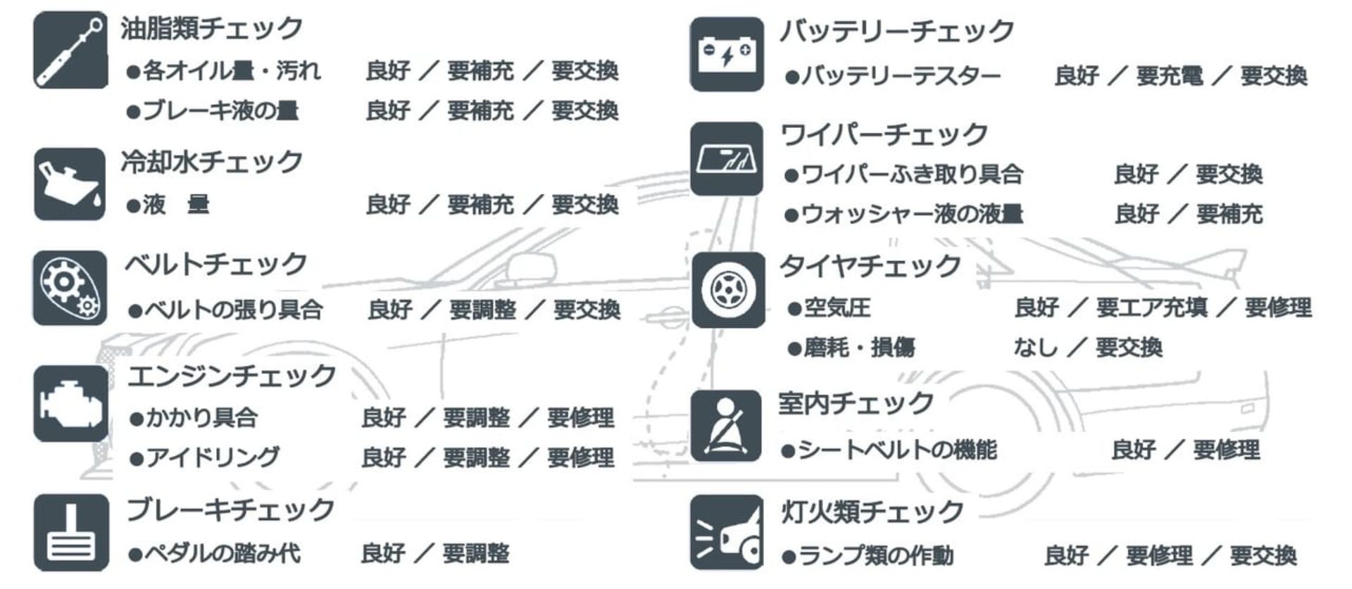 期間中、お車のタイヤ空気圧やバッテリー、オイル等の量をチェックする10ポイント無料チェック✅や