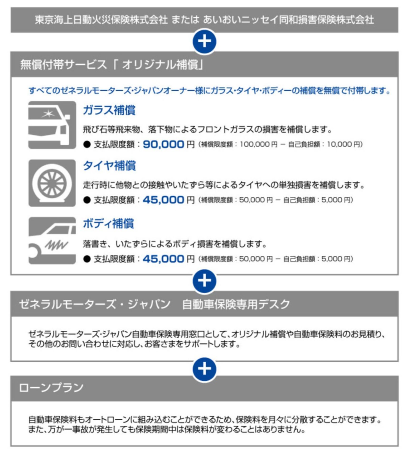 新車/中古車を問わず損害保険会社の自動車保険に、ゼネラルモーターズが提供する無償付帯サービス「オリジナル補償」をプラスしたものです✨