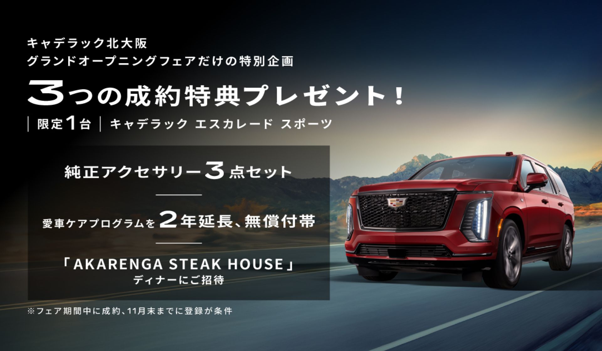 10/25(土)~11/3(月・祝)のフェア期間中、対象のキャデラック エスカレード スポーツを新車でご成約かつ11月末までにご登録いただいたお客様へ3つの成約特典をご用意しております。限定1台のスペシャル企画です!
