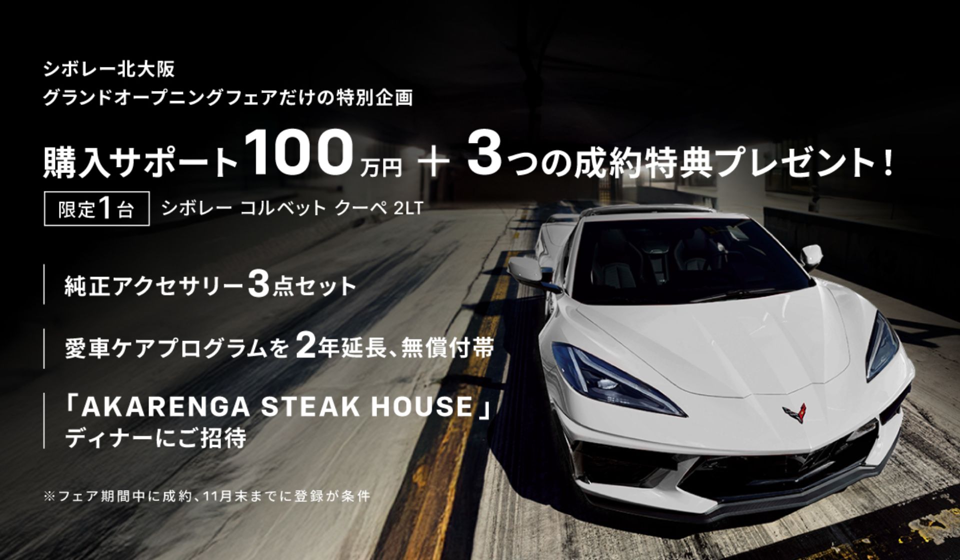10/25(土)~11/3(月・祝)のフェア期間中、対象のシボレー コルベット クーペ 2LTを新車でご成約かつ11月末までにご登録いただいたお客様へ、購入サポート100万円(税込)に加え、さらに3つの成約特典をご用意しております。限定1台のスペシャル企画です!