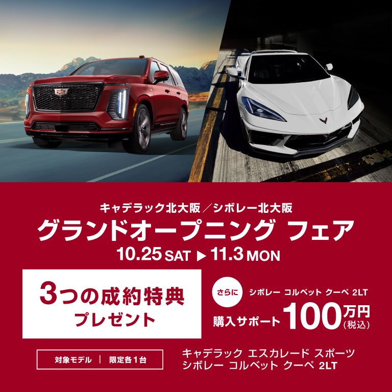 こちらのフェアでは、日頃のご愛顧に感謝の気持ちを込めて、キャデラック エスカレード スポーツとシボレー コルベット クーペ 2LTをそれぞれ限定1台にて、さまざまな成約特典をご提供いたします。グランドオープニングフェアの期間限定の特別条件でのご案内となります。