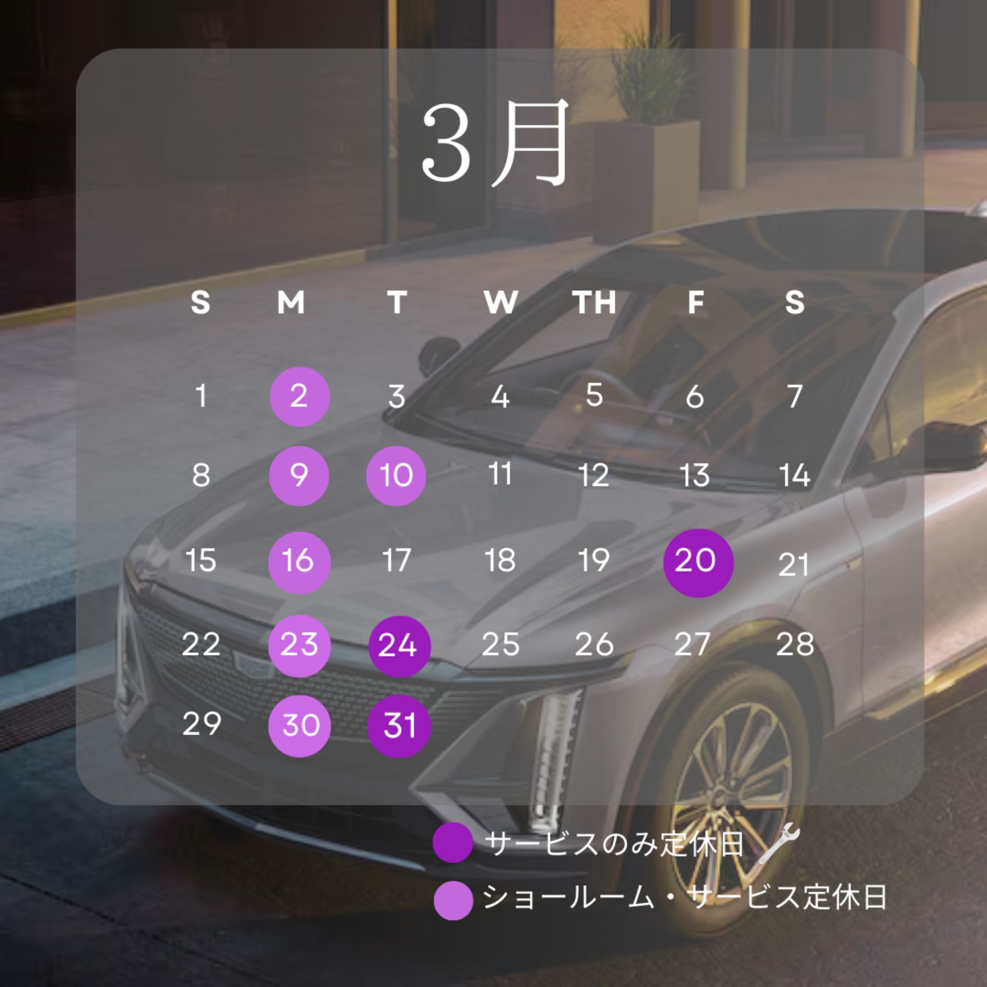 ショールーム/サービスの定休日🚗 2日、9日、10日、16日、23日、30日