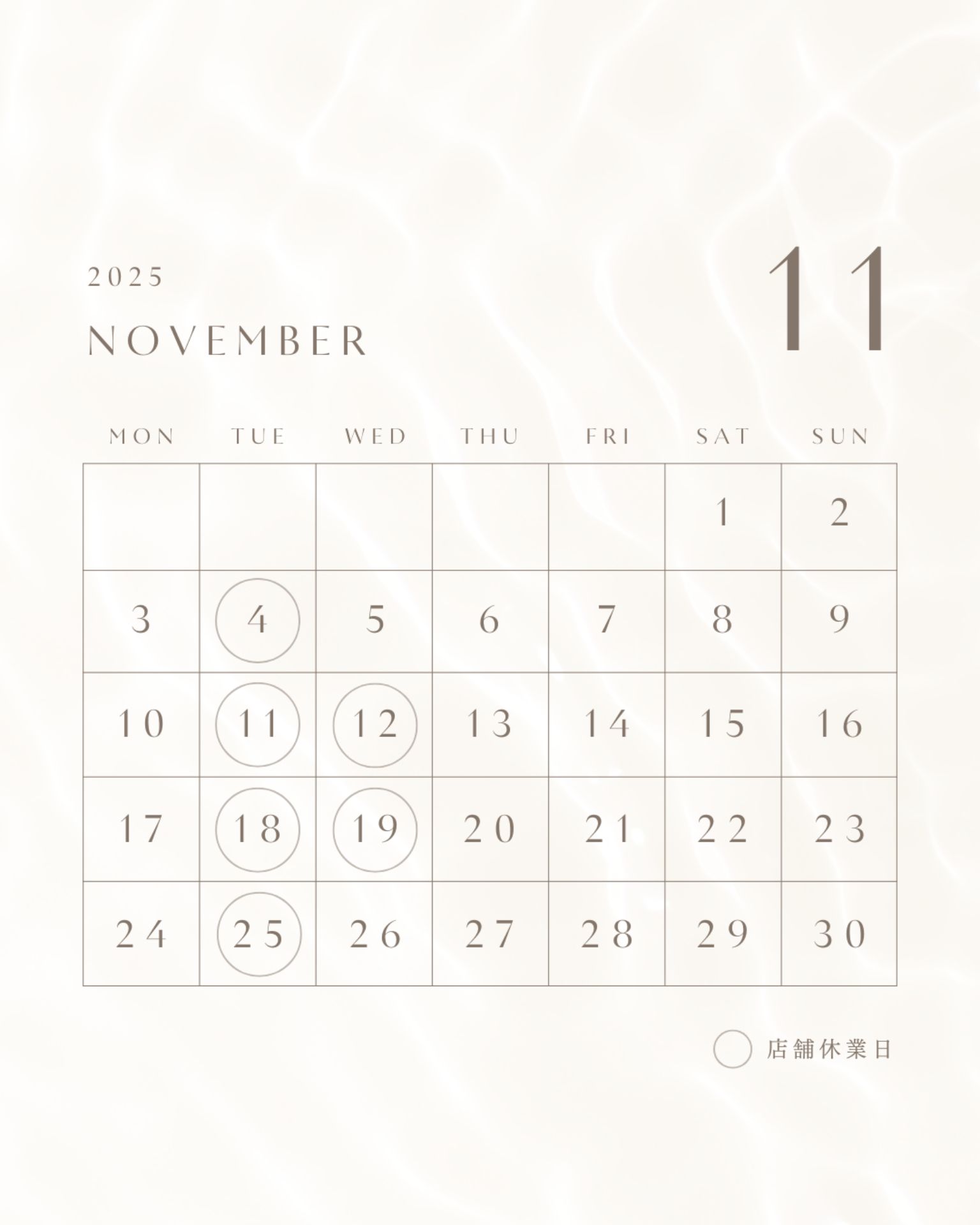 11月の定休日をお知らせいたします。