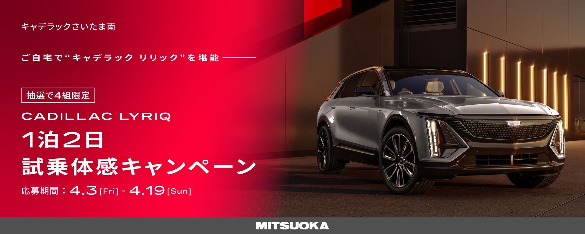 なんと、キャデラックが誇る先進のラグジュアリーEV「LYRIQ(リリック)」を、1泊2日でご体感できる モニターキャンペーン がスタートいたしました!👏