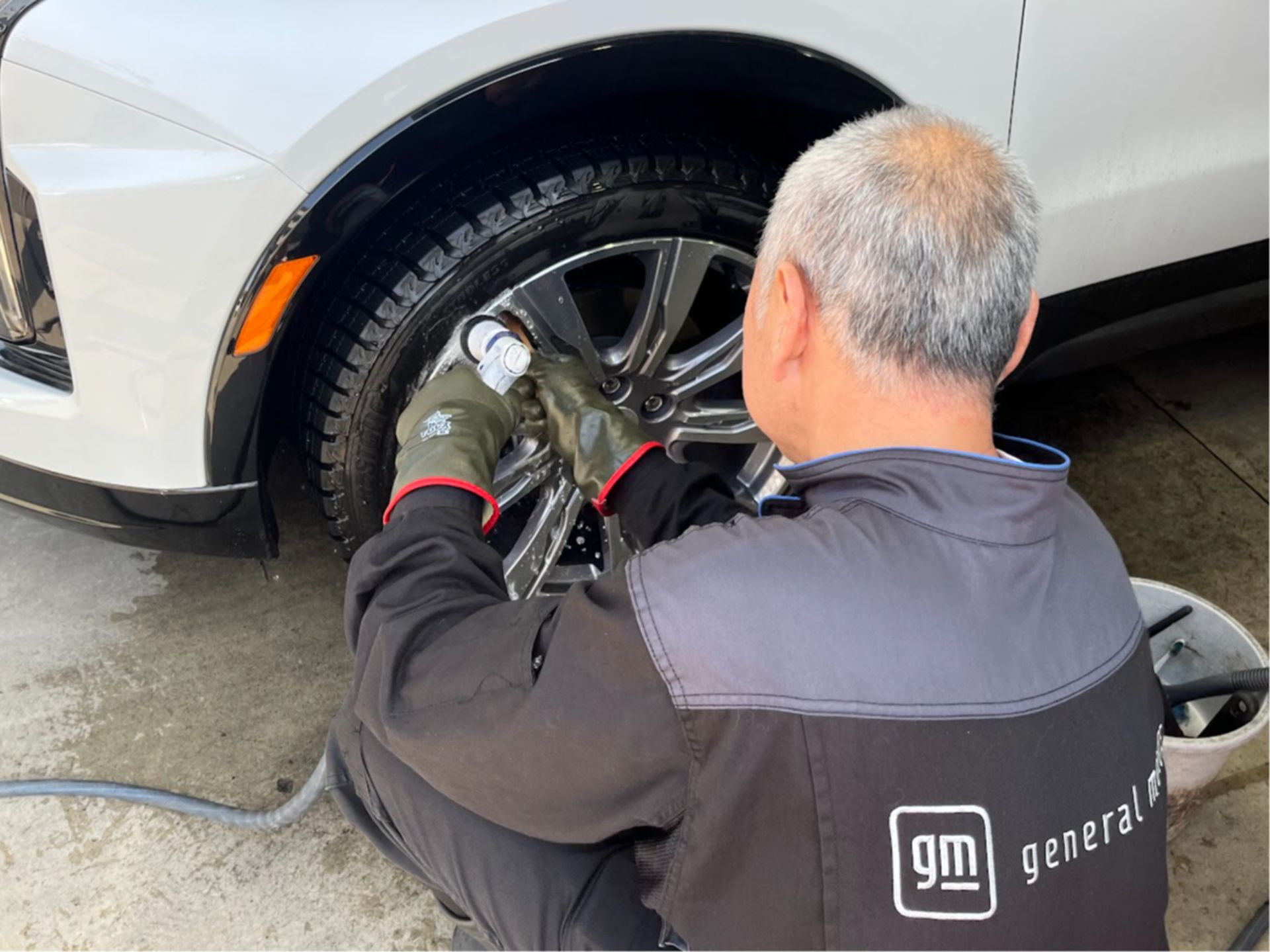 ボディを先に洗ってからホイール・タイヤを洗うと、汚れた水や洗剤が飛び散ってシミになったり、