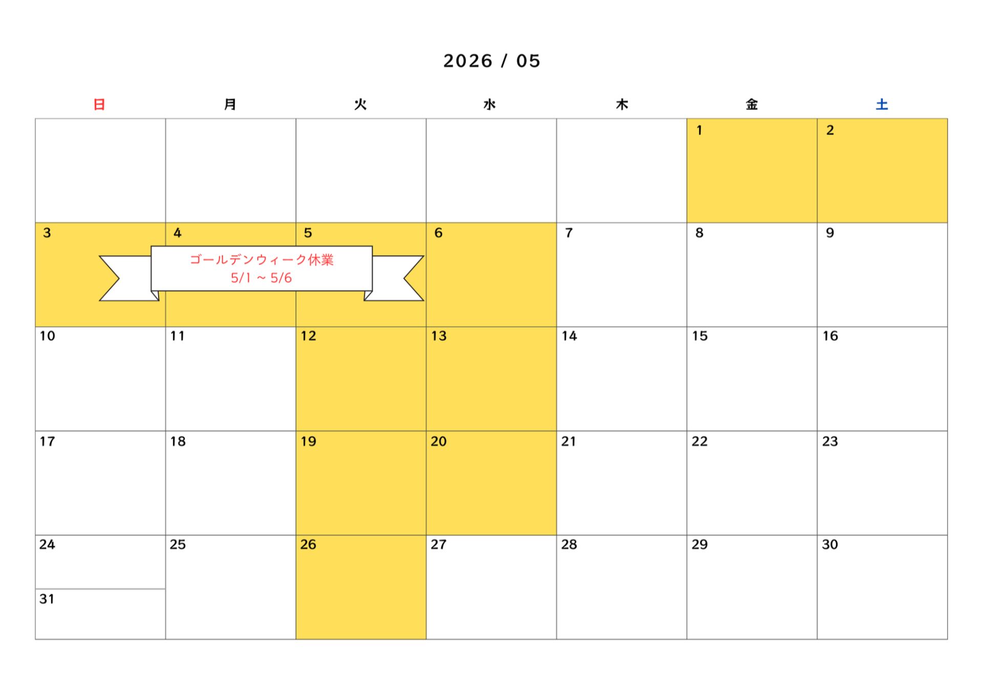 2026年5月1日(金)~ 2026年5月6日(水)はゴールデンウィーク休業となります。