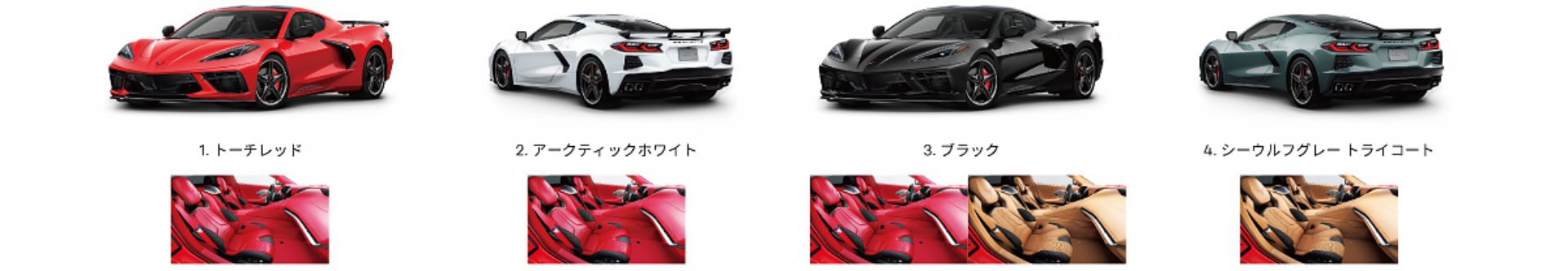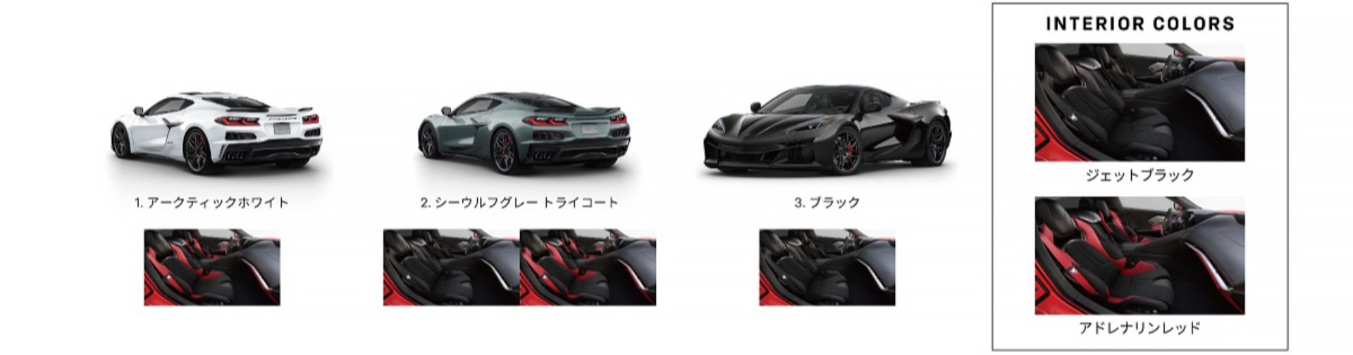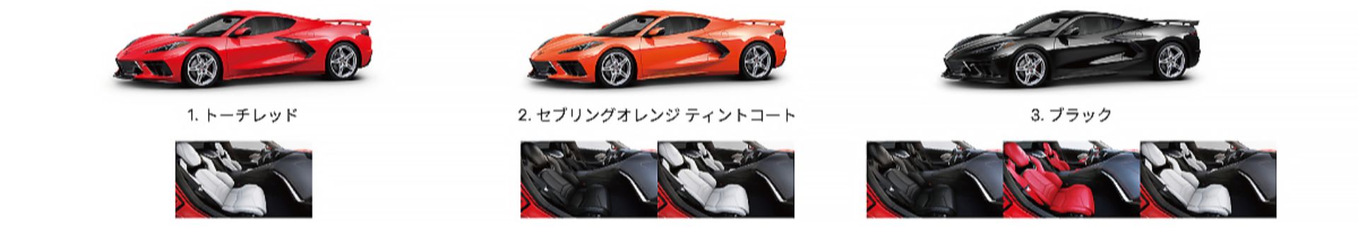 当社がご用意しているシボレー コルベット 3LTのボディカラーとインテリアカラーのバリエーションです。在庫状況など詳しくは当ショールームまでお気軽にお問い合わせください。