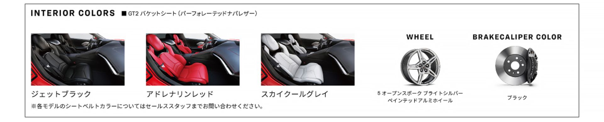 当社がご用意しているシボレー コルベット 2LTのボディカラーとインテリアカラーのバリエーションです。在庫状況など詳しくは当ショールームまでお気軽にお問い合わせください。