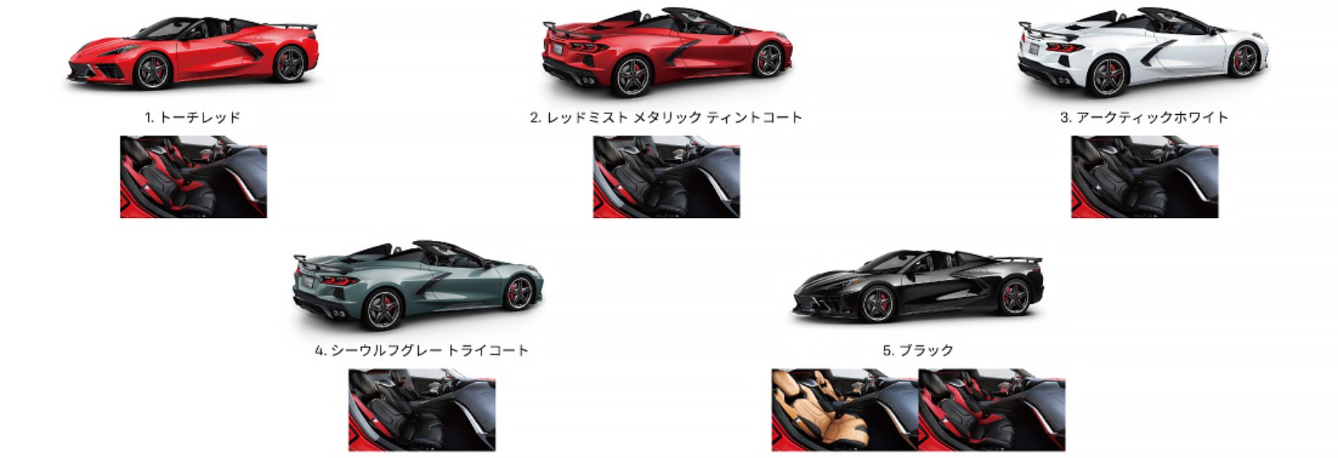 当社がご用意しているシボレー コルベット コンバーチブルのボディカラーとインテリアカラーのバリエーションです。在庫状況など詳しくは当ショールームまでお気軽にお問い合わせください。