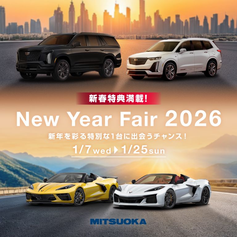 1月7日(水)~1月25日(日)、皆様への感謝の気持ちを込めまして「ミツオカ New Year Fair 2026」を開催いたします。期間中は、ミツオカグループだけの特典やプレゼントを多数ご用意して、皆様のご来店をお待ちしております。お気軽にショールームへお越しいただき、キャデラック/シボレーの魅力をぜひご体感ください。