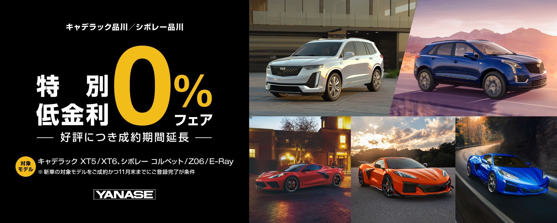※本特典はヤナセグローバルモーターズだけのスペシャル企画です。2025年11月30日(日)まで、キャデラック品川/シボレー品川、キャデラック楠/シボレー楠、キャデラック大阪中央/シボレー大阪中央のみでご案内いたします。対象車種の新車をご成約かつ11月末日までにご登録を完了されたお客様を対象とさせていただきます。