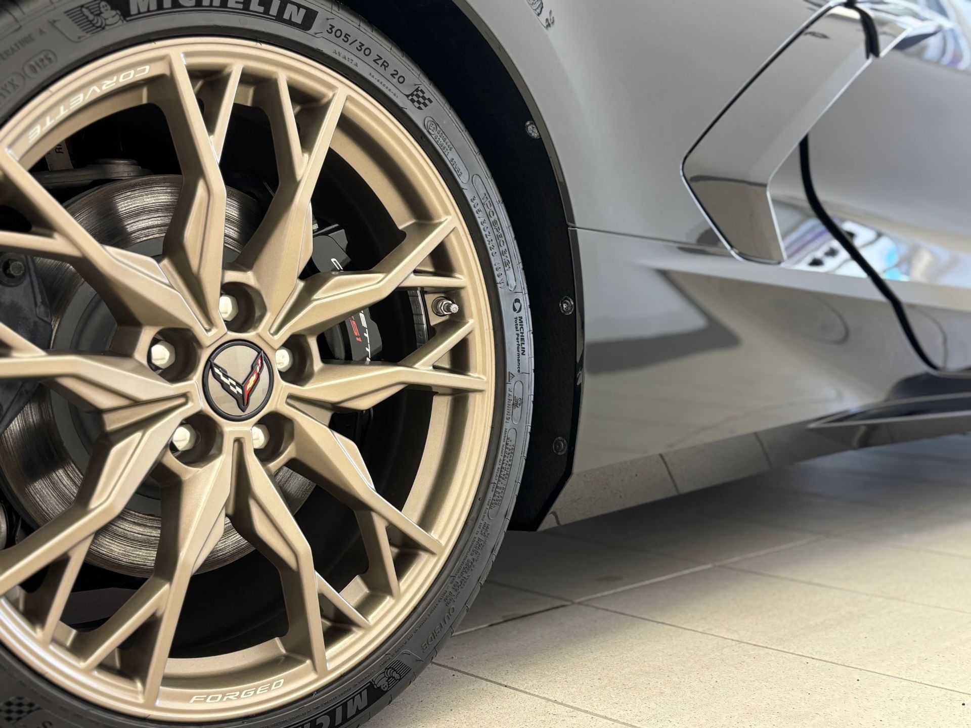 オーナー様のコルベットには、純正オプションの「20-スポーク テックブロンズ アルミホイール」をご選択いただいております。