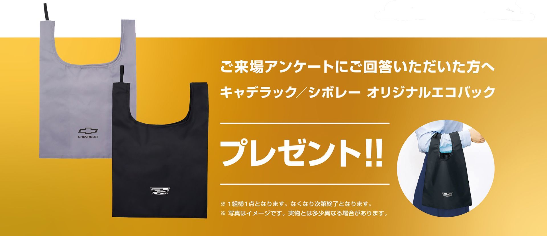 イベントの2日間、会場にてアンケートにお答えいただいた皆様へ、キャデラック/シボレー オリジナル エコバッグをプレゼントいたします👜