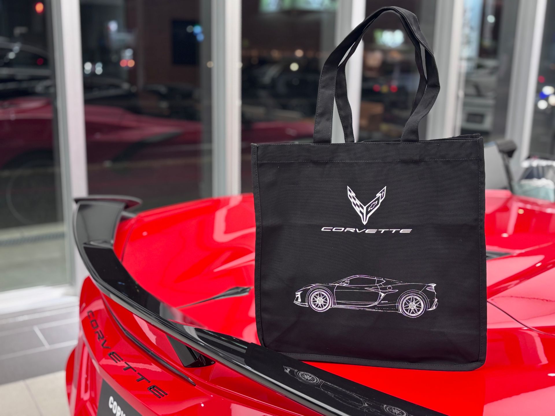 コルベット C8 のクロスフラッグロゴとイラストをデザインしたトートバッグです。