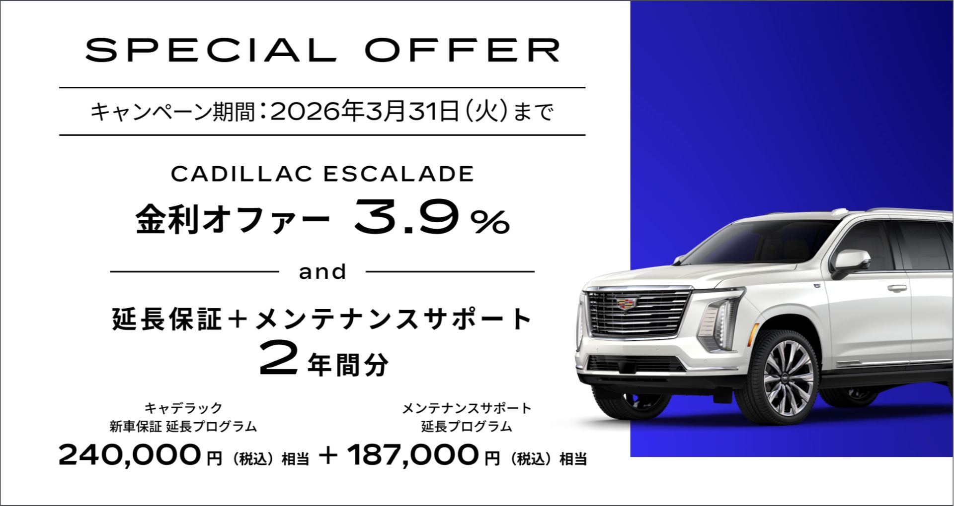 2026年 3月31日までの期間中、ESCALADE(エスカレード)を新車でご成約・ご登録いただいたお客様へ、以下の特典をすべてご提供させて頂きます。