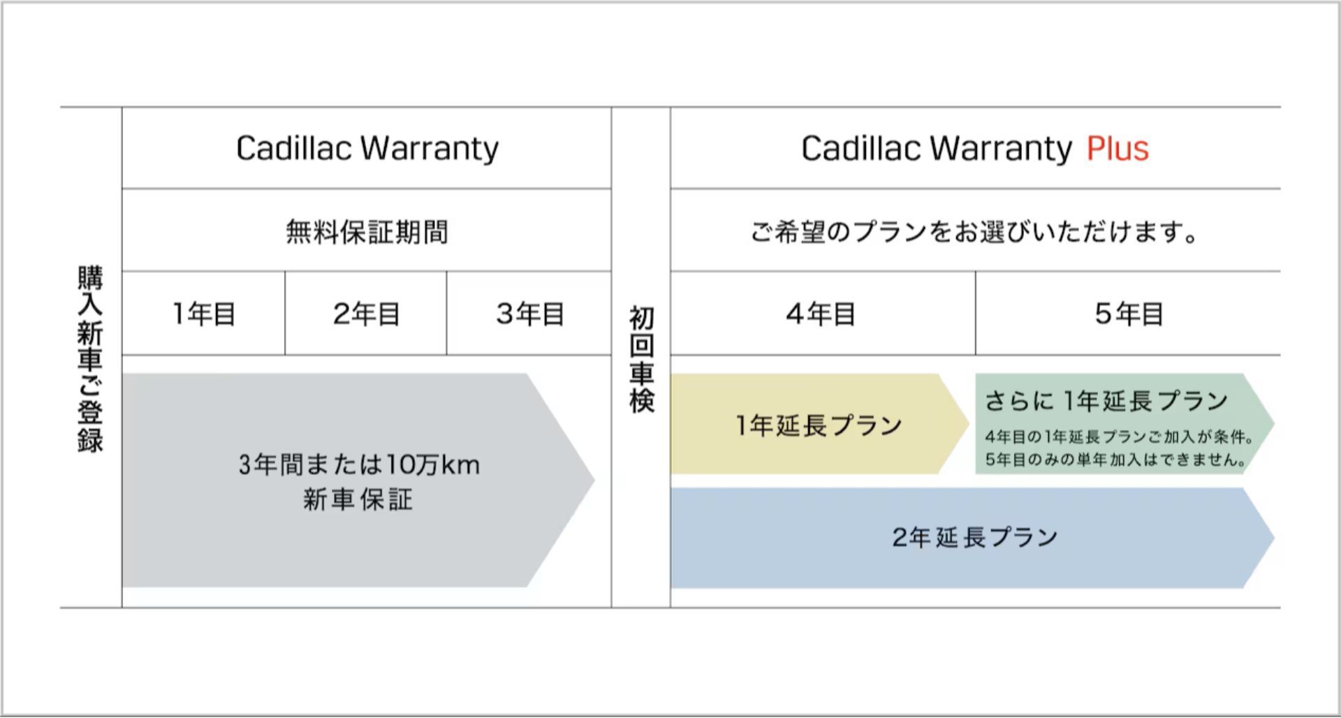 新車登録から3年間または10万kmの新車保証に加え、本来は有償の延長保証プログラム「Cadillac Warranty Plus」を今なら無償付帯いたします。 ご希望に応じて4年目・5年目まで、2年間分の保証を延長いただけます。