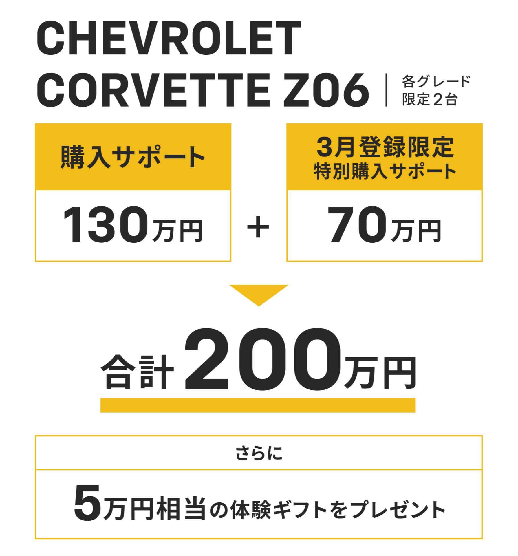 シボレー コルベット[Z06] をご検討のお客様には合計 200万円(各グレード 2台限定)の購入サポートをご用意いたします。