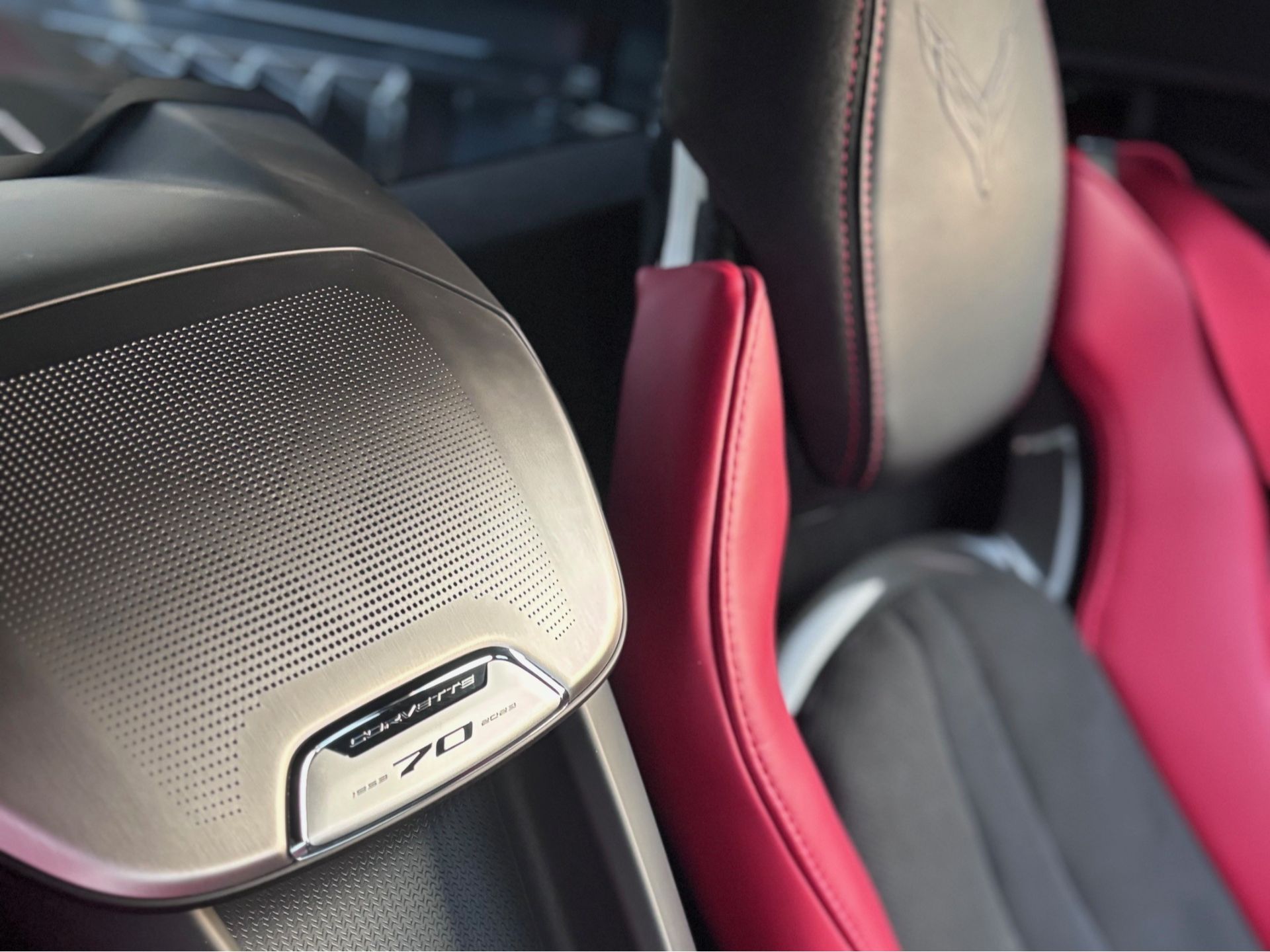 2023年モデルは、「シボレーコルベット 誕生70周年」を記念したプレートがセンタースピーカーに刻印されております。
